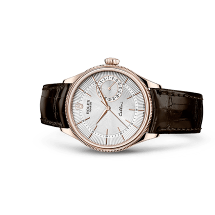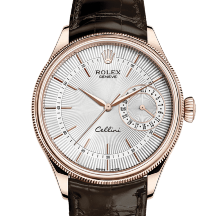 Reference:50505Model case:39 mm. 18 ct Everose gold. polished finishBracelet:Leather strapDial:WhiteBezel:Double bezel. domed and fluted