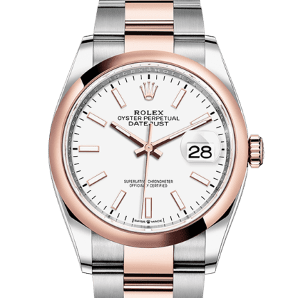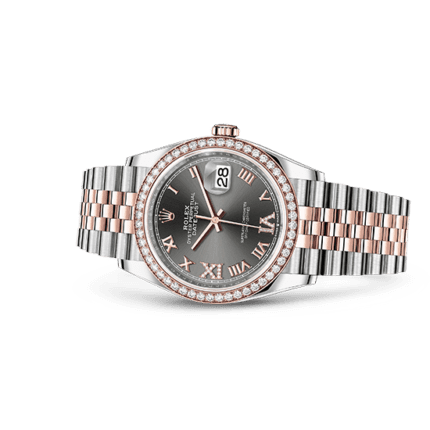 Reference:126281RBRModel case:Oyster. 36 mm. Oystersteel. Everose gold and diamondsBracelet:Jubilee. five-piece linksDial:Dark rhodium set with diamondsBezel:Set with diamonds