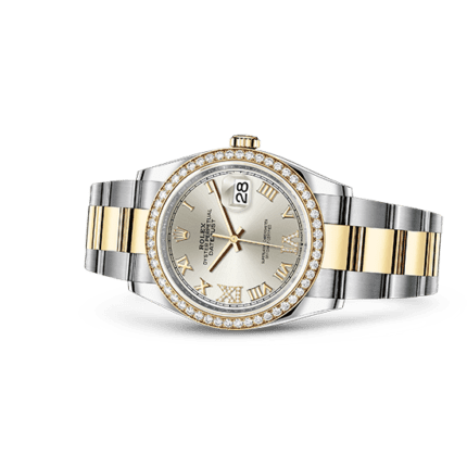 Reference:126283RBRModel case:Oyster. 36 mm. Oystersteel. yellow gold and diamondsBracelet:Oyster. flat three-piece linksDial:Silver set with diamondsBezel:Set with diamonds
