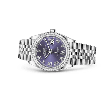 Reference:126284RBRModel case:Oyster. 36 mm. Oystersteel. white gold and diamondsBracelet:Jubilee. five-piece linksDial:Aubergine set with diamondsBezel:Set with diamonds