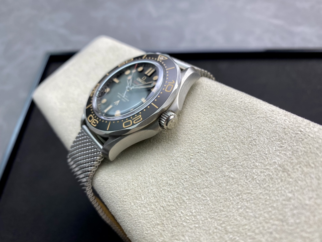 Omega Seamaster Diver 300M Co-Axial Master Chronometer 42mm Titanium Mesh Bracelet 210.90.42.20.01.001. It is made with the same materials and to the same specifications as the genuine watch, except for the movement, which is a cloned movement instead of the genuine Omega Master Chronometer movement.
