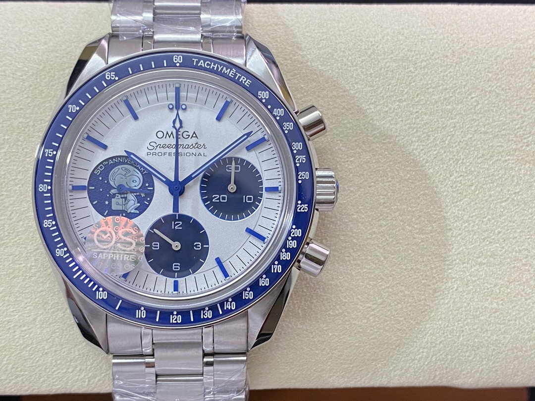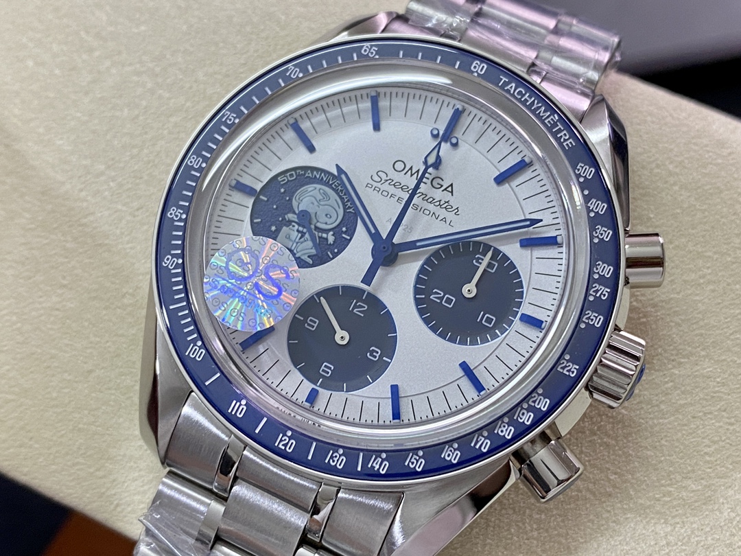 Omega Snoopy 150th Anniversary watch is a high-quality Superclone of the original Omega Speedmaster Silver Snoopy Award 50th Anniversary watch. It features a 42mm stainless steel case with a black ceramic bezel and a Hesalite crystal. The dial is black with a silver Snoopy logo and a moon phase display. The watch is powered by the VS Factory 3861 automatic movement, which is a clone of the original Omega Co-Axial Master Chronometer caliber 3861.